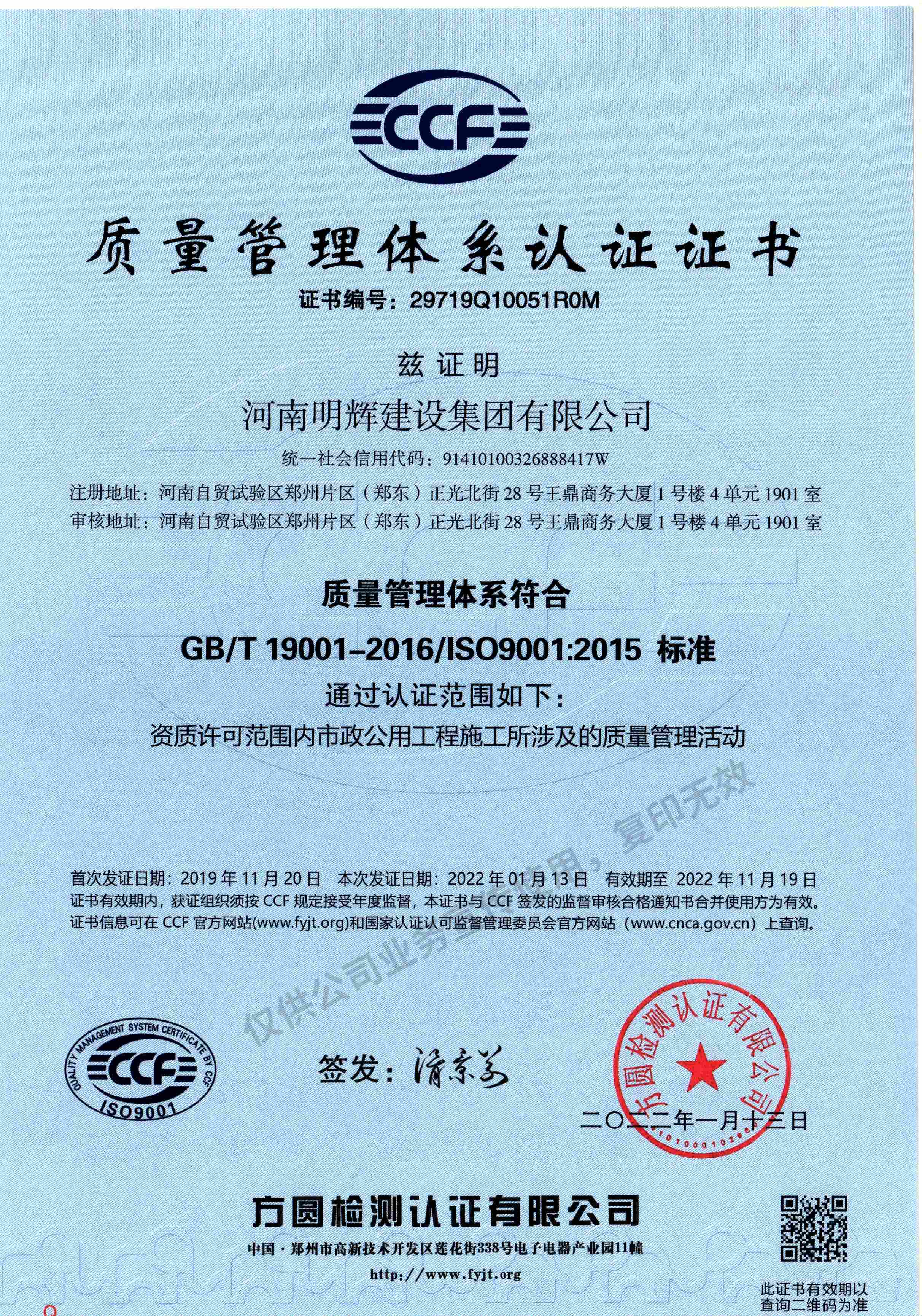 质量管理体系认证证书